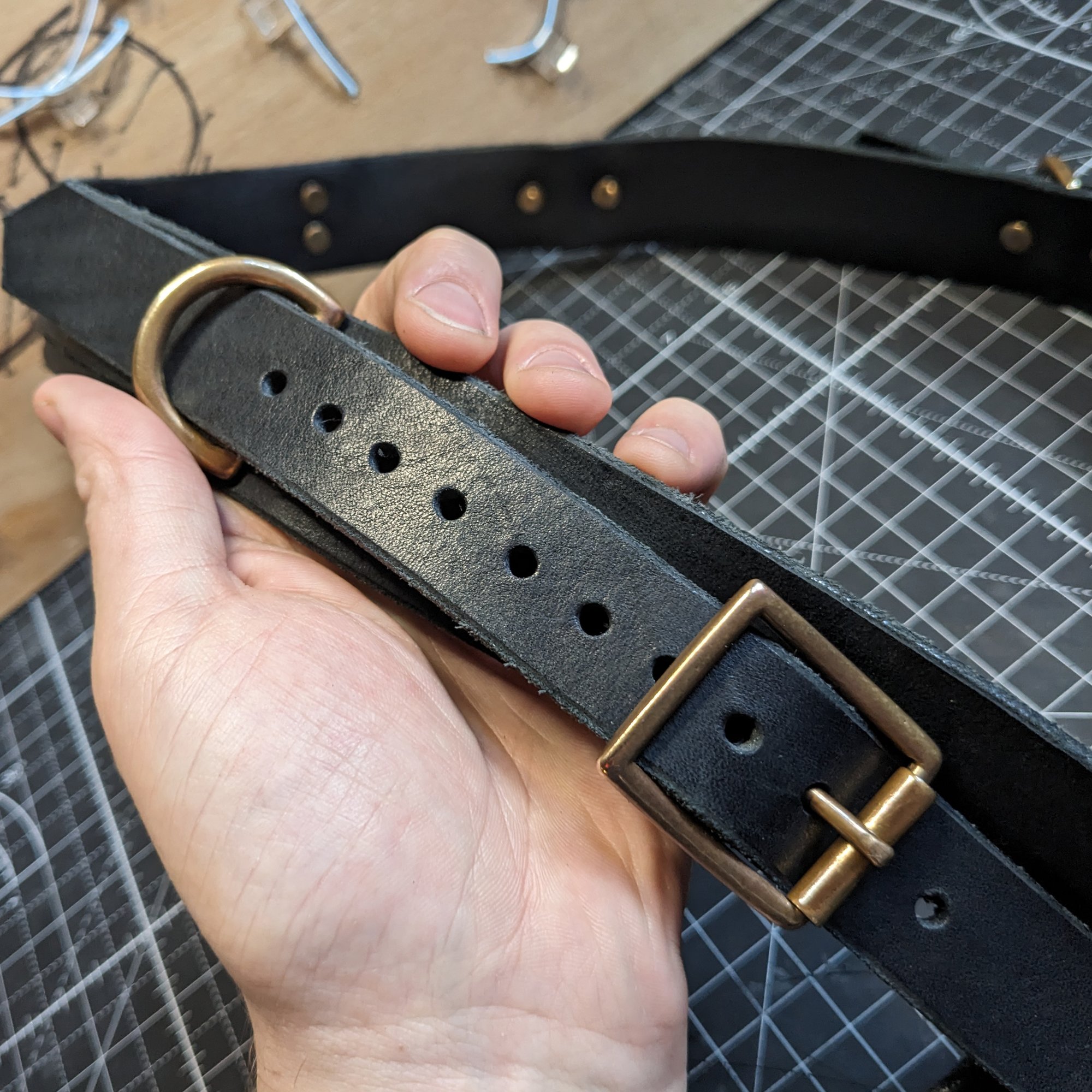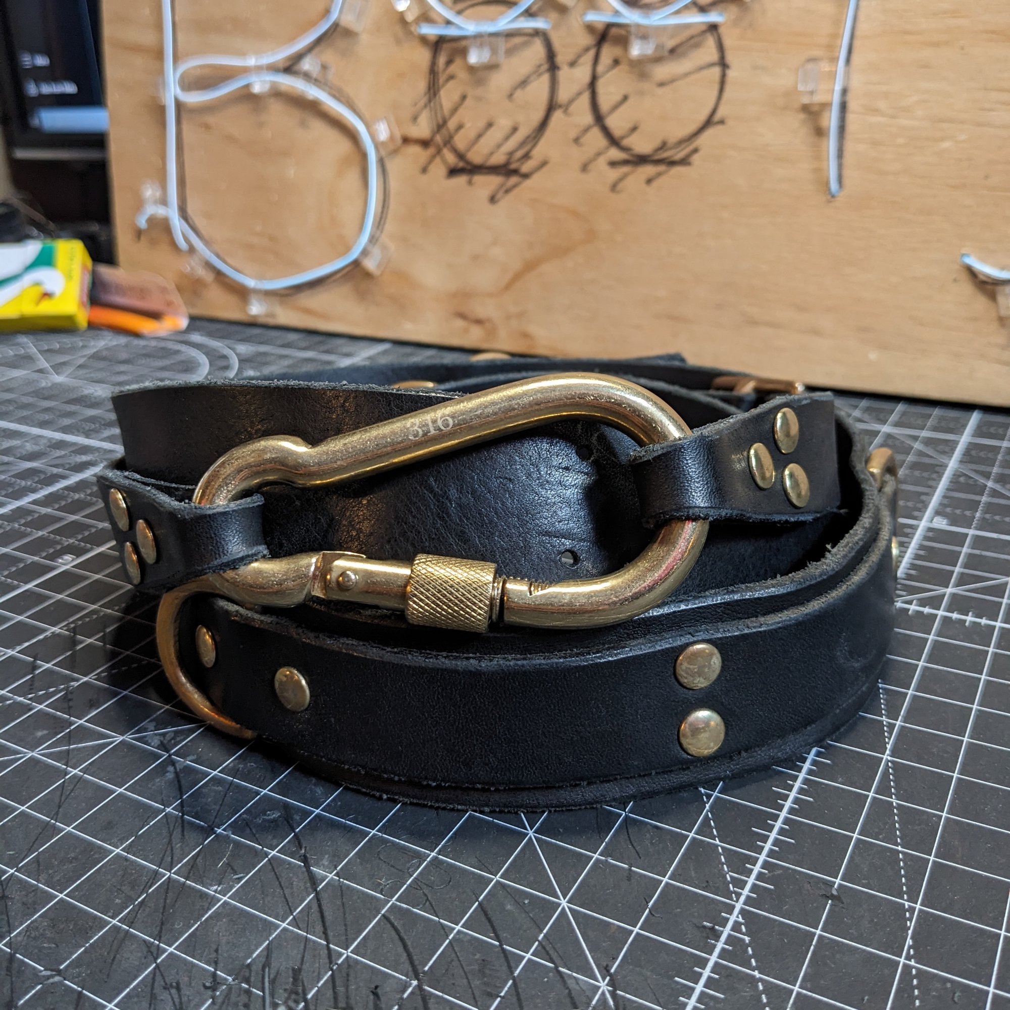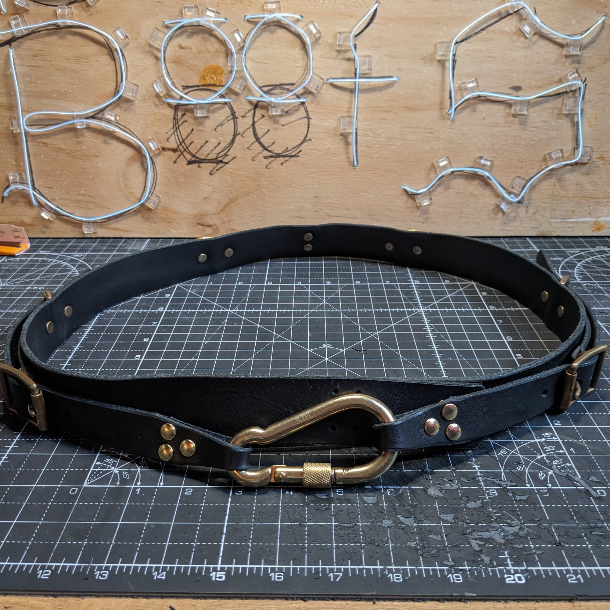 Two bondage loops are affixed to each side of the belt, allowing for the attachment of keyclips, hankies, or wrist restraints. Hardware is available in brass or nickel.